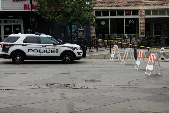 CU Boulder police cars blocked off some of the streets and businesses of the Hill on Oct. 2, 2022. (Io Hartman/CU Independent)