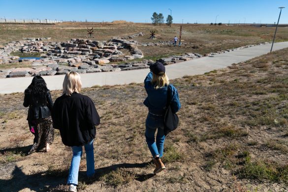 Lisa Solberg points to the location of her sculpture art in Aurora, CO, on Saturday, Oct. 22, 2022. (Io Hartman/CU Independent)