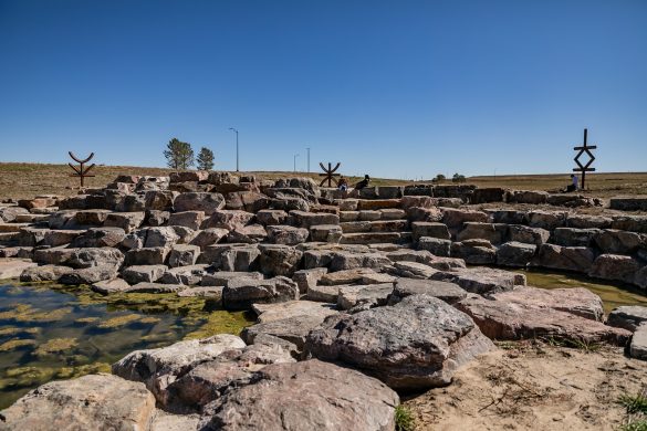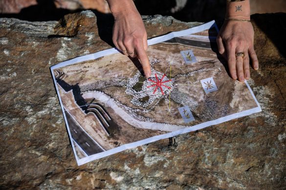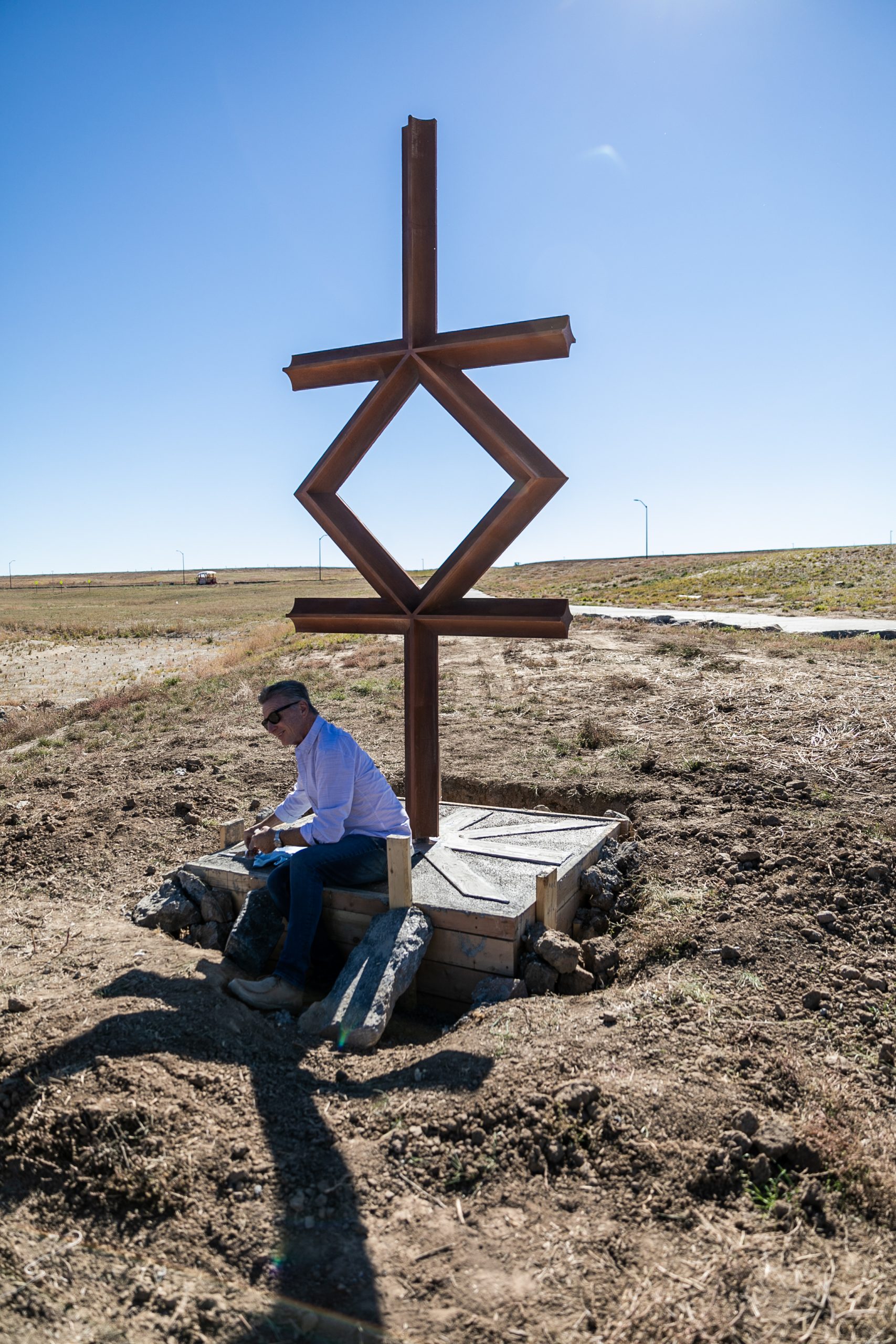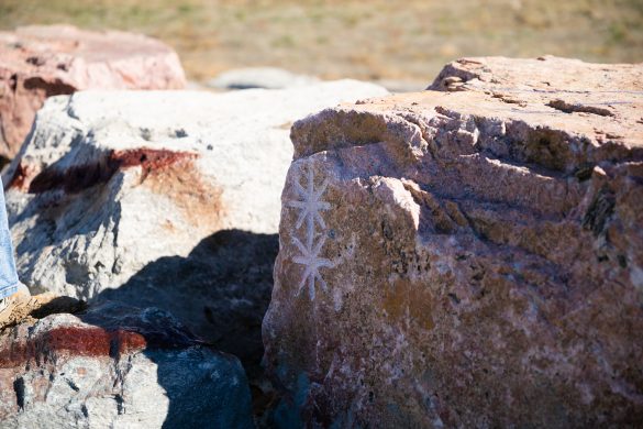 Near a sea of buildings under construction and beige grass dehydrated by the early-autumn sun, sits a set of three ancient-looking sculptures, surrounded by large, flat rocks and pools of water. In the center of the field, a rusty brown eight-pointed star has been painted on the rocks. Some of the corners point directly toward the sculptures, while others point toward symbols engraved in the rock.