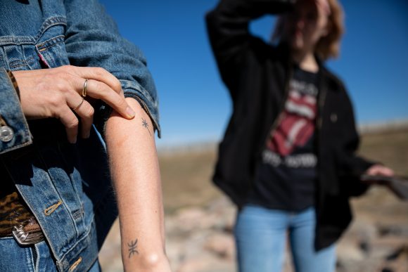 Artist Lisa Solberg displays her self-designed tattoo that relates to her sculpture art in Aurora, CO, on Saturday, Oct. 24, 2022. (Io Hartman/CU Independent)