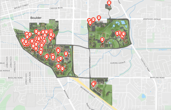 A screenshot of CU Boulder’s interactive campus map on Nov. 8, 2022 filtered to show gender-neutral bathroom locations with red pinpoints of toilets.