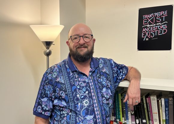 Morgan Seamont, the director of CU’s Pride Office, standing in front of a bookcase in the Pride Office inside the Center for Community on Nov. 8, 2022. (Izzy Fincher, CU News Corps)