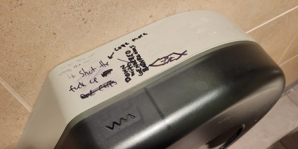 Grafitti in the left all-gender restroom on the second floor of the Norlin Library on Oct. 4, 2022. (Courtesy of Niles Honeywick)