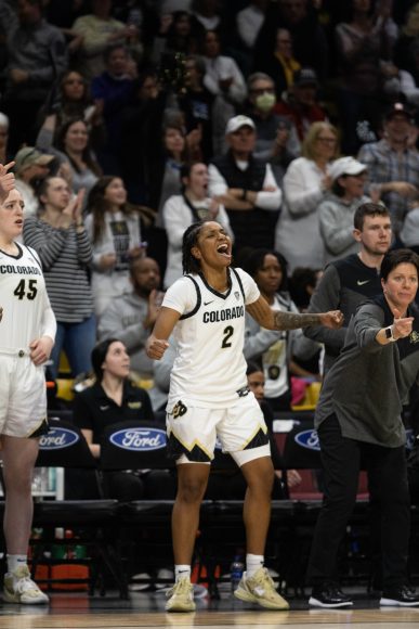 Junior guard Tameiya Sadler celebrates during the second overtime at the CU Events Center. Feb. 23, 2023. (Kara Wagenknecht/CU Independent)