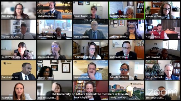 University of Colorado Board of Regents university affairs committee meets remotely on April 18, 2023, discussing campus safety and weapons policy. (Isabella Hammond/CU Independent)