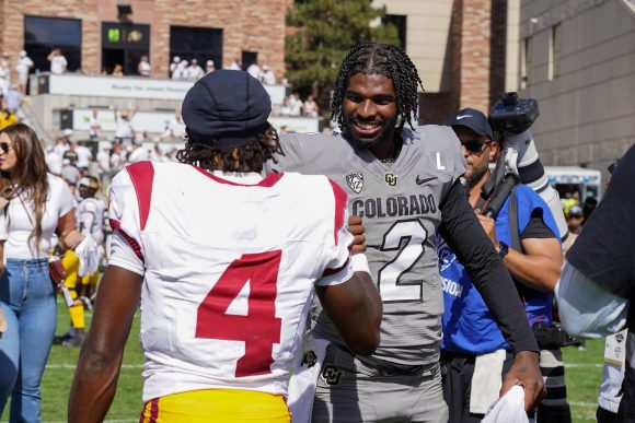 Junior quarterback Shedeur Sanders shales hands with USC Trojans player post game at Folsom Field on Saturday, Sept. 30, 2023. (Rachel Glazer/CU Independent)