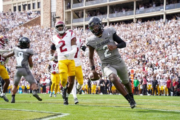 Junior quarterback Shedeur Sanders after a touchdown run at the game against USC at Folsom Field on Saturday, Sept. 30, 2023. (Rachel Glazer/CU Independent)