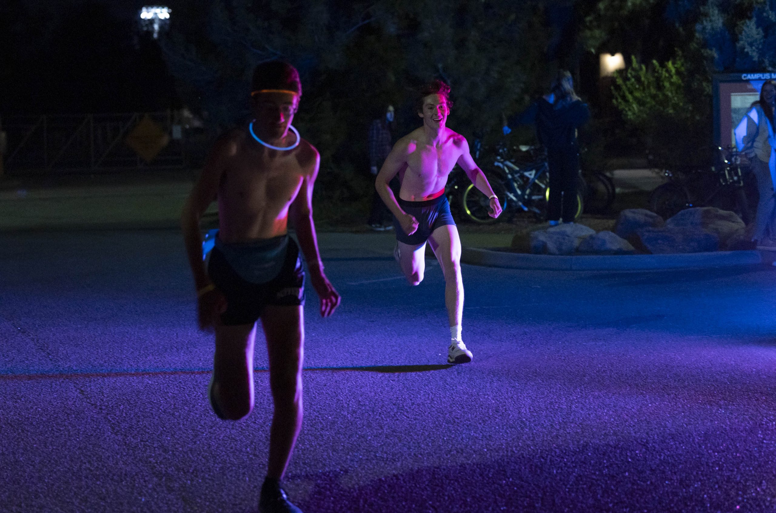 At 7 p.m., students began to line up at the gate for the mile-long run. As music blasted and fog billowed from fog machines, students shoved their way through the small gate out of the Koenig Alumni Center’s yard. The glowing and “nearly naked” students ran a mile long loop through campus and then back to the Alumni Center.