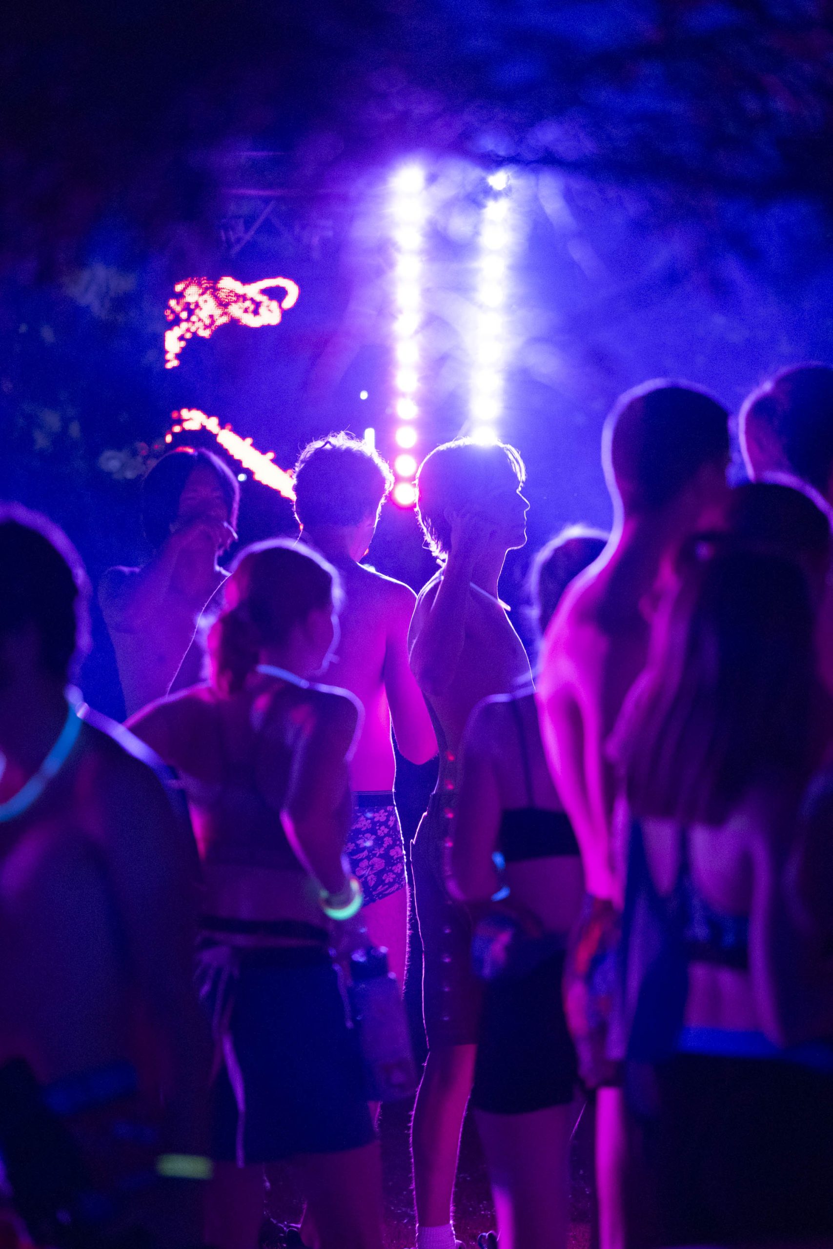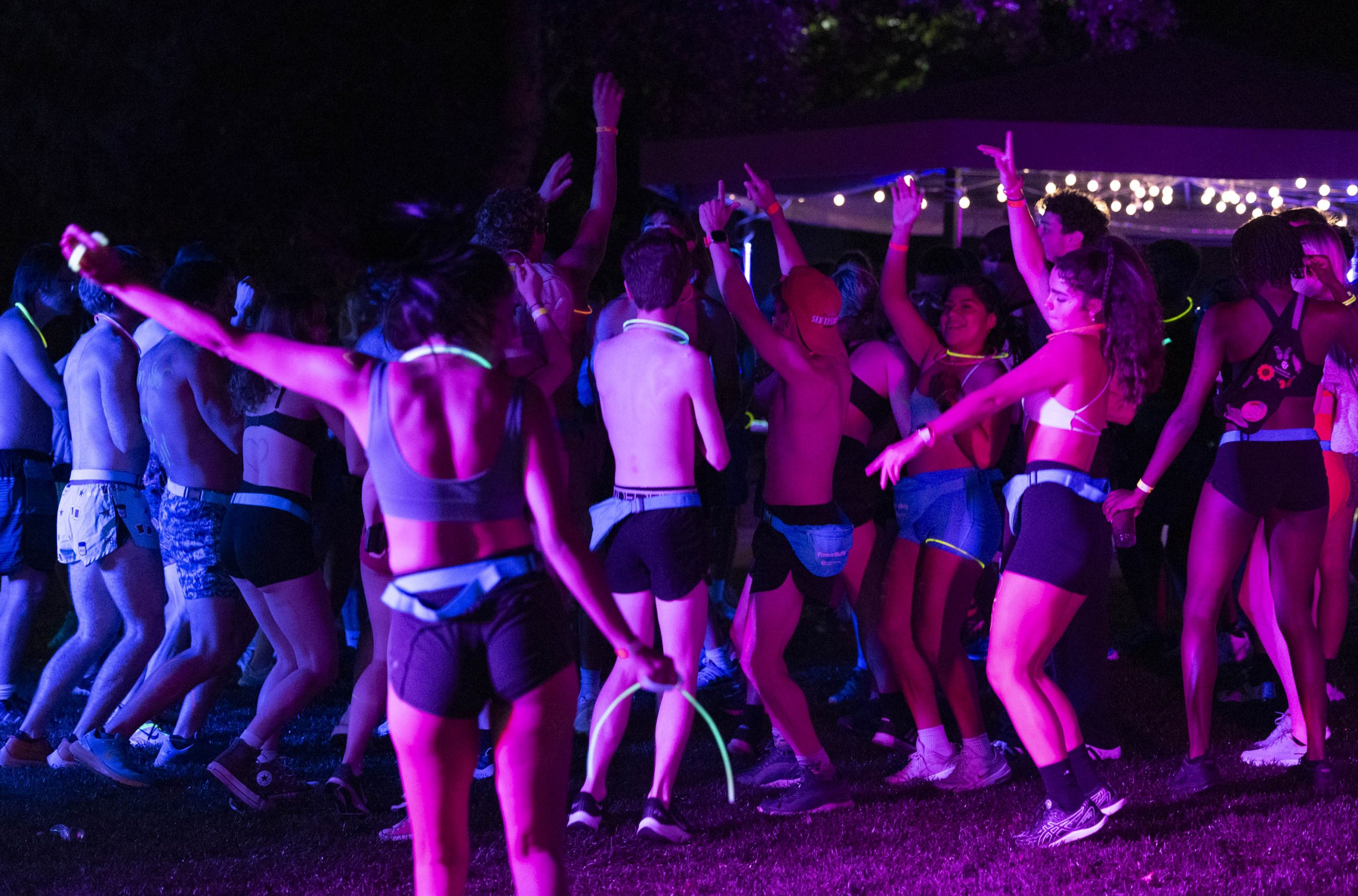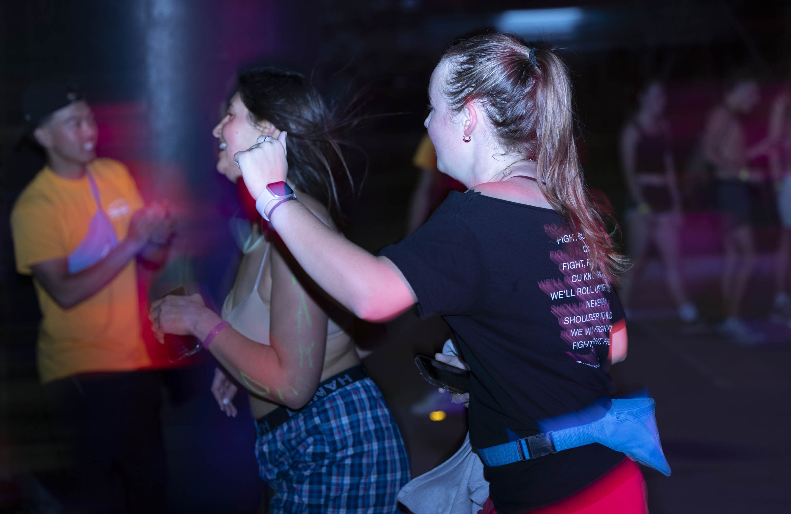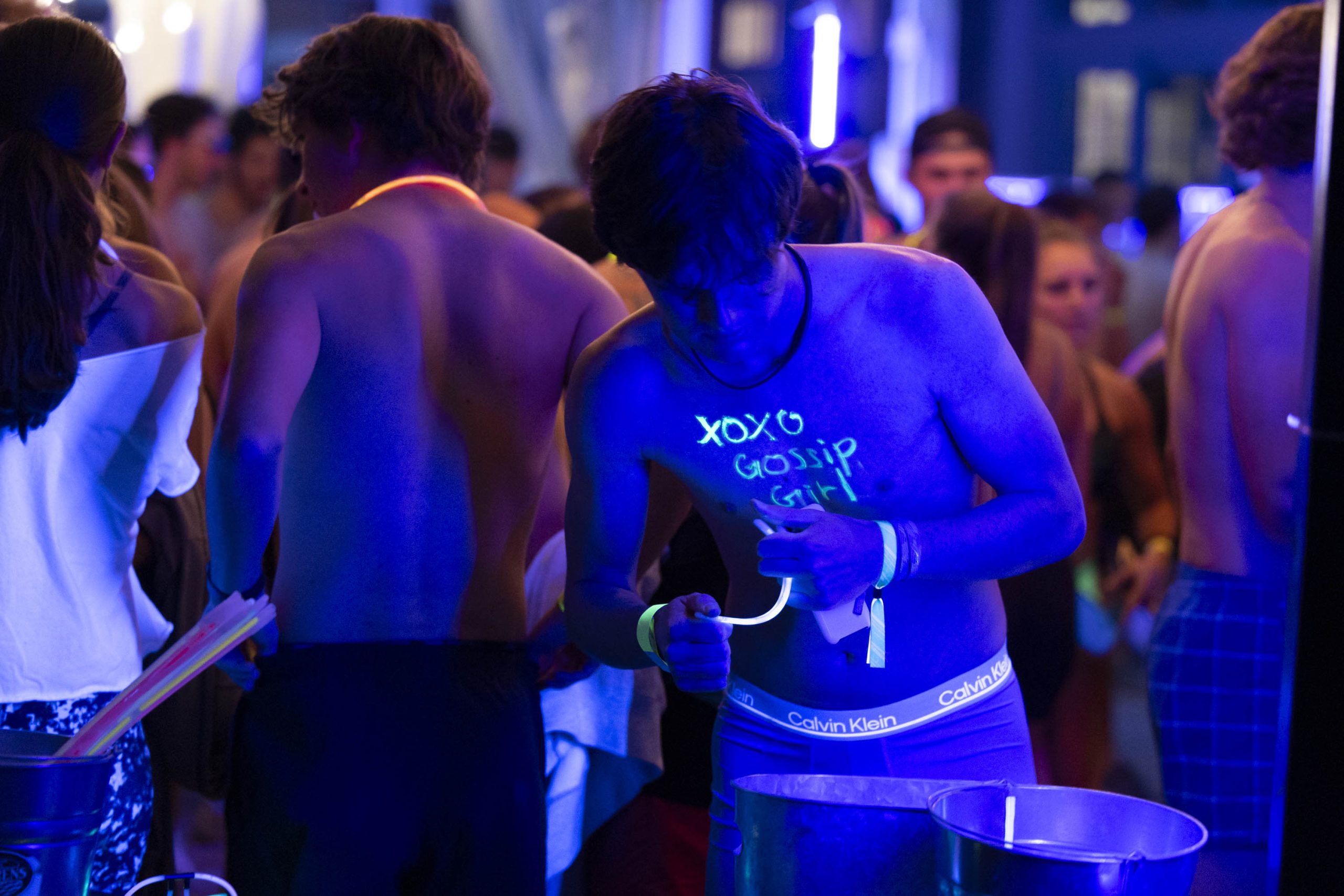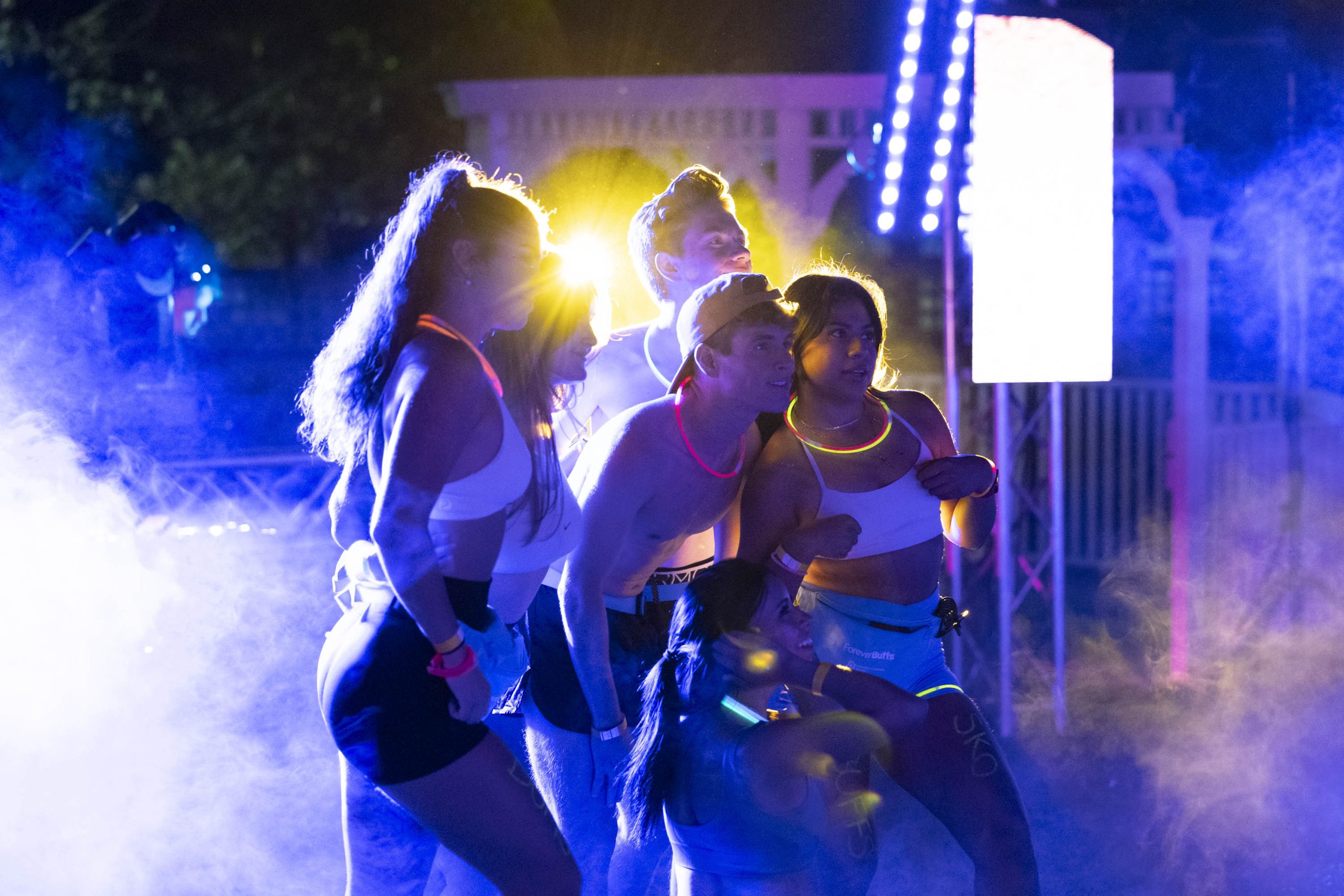 Students began checking in at 6:30 p.m. After students finished donating clothes, some started dancing to the live DJ while others shotgunned root beer. Before the race began, students decorated themselves with paint pens and glow stick accessories. Most students wore underwear or shorts, but a few came in costumes, wearing a banana suit or glowing cowboy hats. The venue was covered in brightly colored UV lights that lit up the body paint. Students wrote sayings on their bodies like: “sko buffs,” “xoxo gossip girl,” “I love Chip” and “I’m faster than you!”
