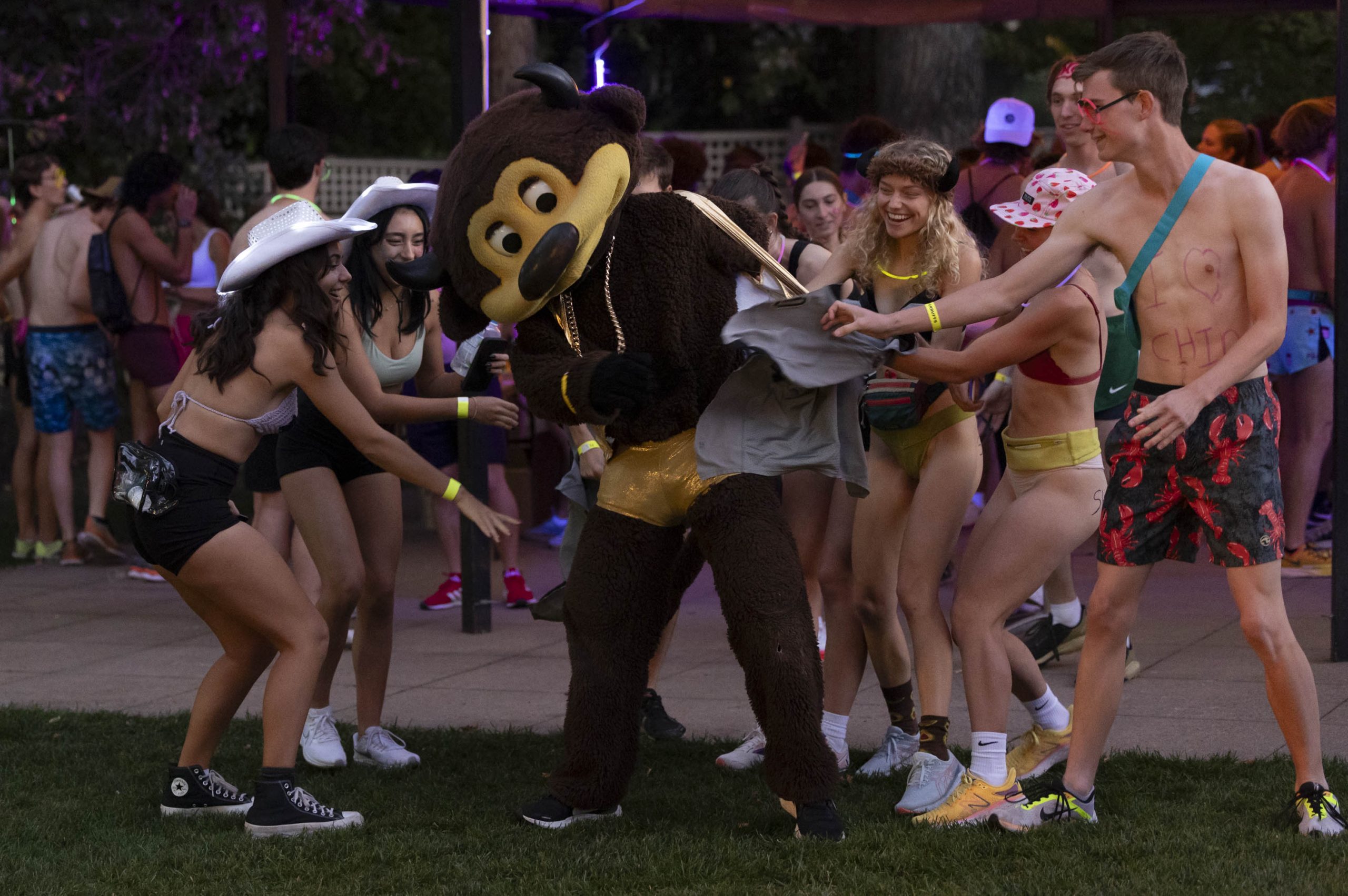 Students rip a jersey off of the CU Boulder mascot, Chip, before the Nearly Naked Mile on Thursday, Oct. 5, 2023. (Clementine Miller/CU Independent)