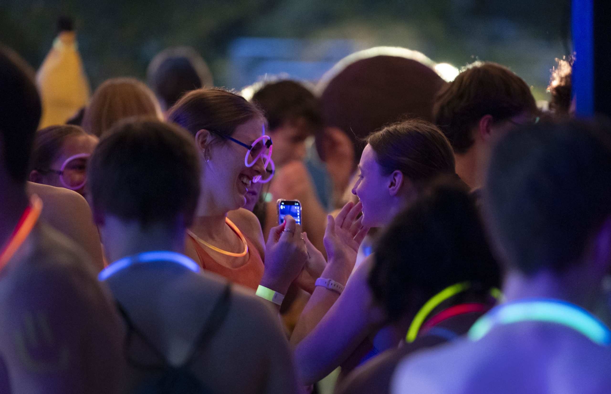 Students laugh while preparing for the Nearly Naked Mile by drawing on each other with paint pens and wearing glow sticks on Thursday, Oct. 5, 2023. (Clementine Miller/CU Independent)