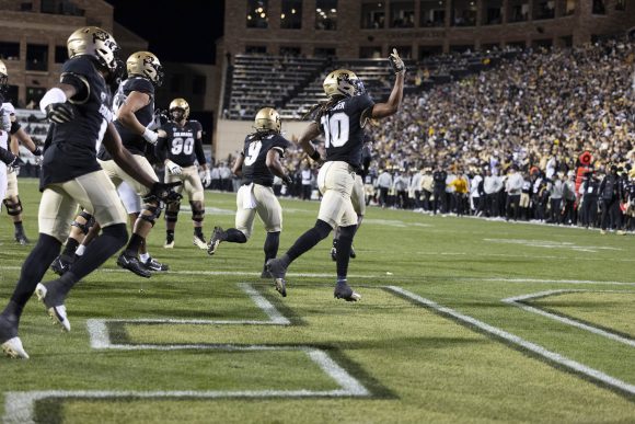 Graduate student wide receiver Xavier Weaver gestures to the student section after scoring a touchdown during the game against Stanford University on Friday, Oct. 13, 2023. (Clementine Miller/CU Independent)