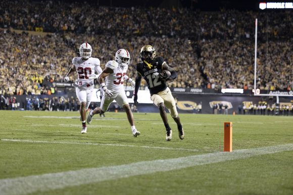 Sophomore cornerback Travis Hunter scores a touchdown during the game against Stanford University on Friday, Oct. 13, 2023. (Clementine Miller/CU Independent)