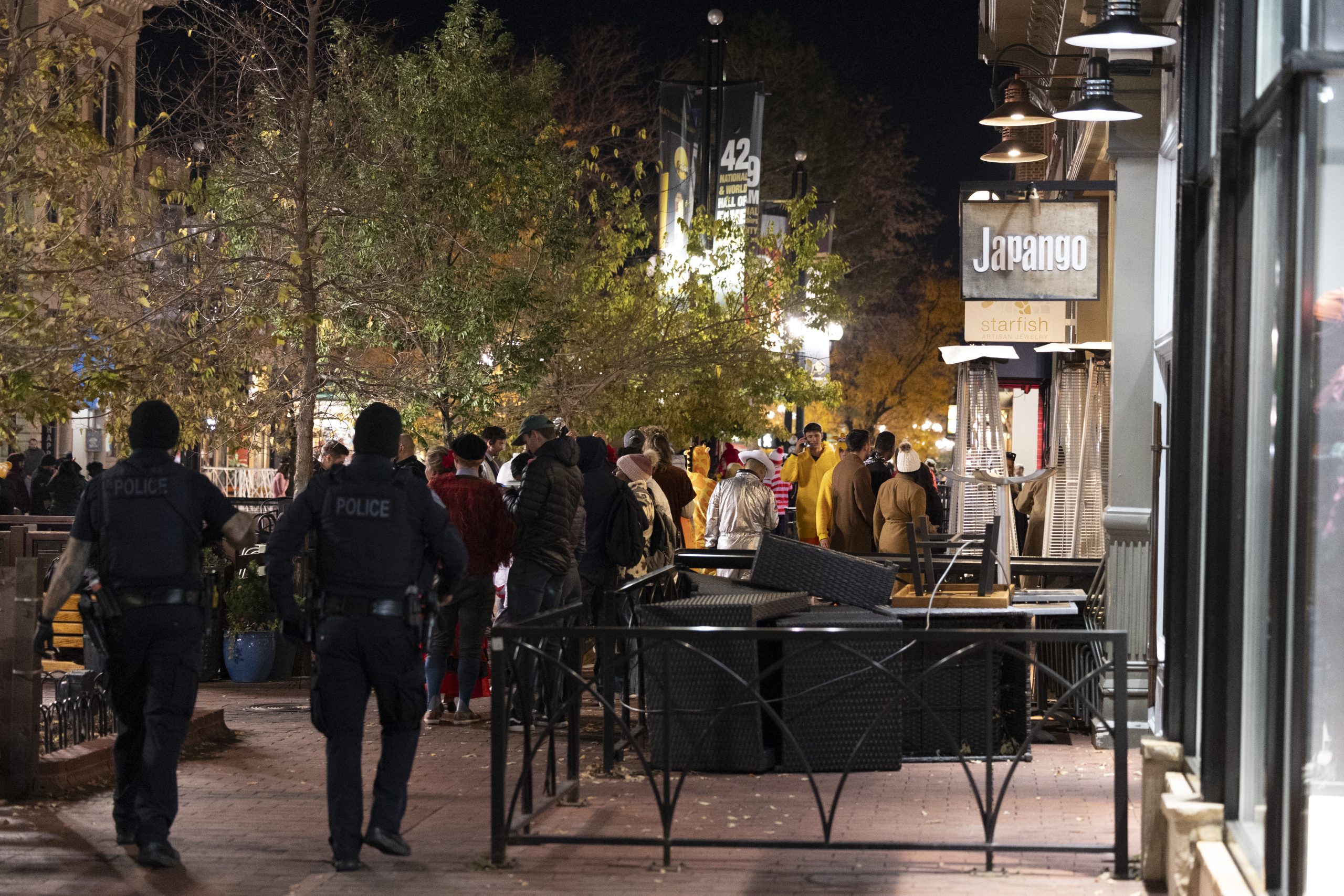 Police officers stand on Pearl Street Mall next to a barricade during the previously scheduled time for the Mall Crawl on Friday, Oct. 27, 2923. (Clementine Miller/CU Independent)