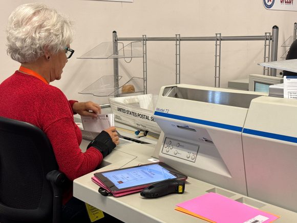 Election worker at the Boulder County Clerk and Recorder Offices works at a machine that separates ballots from their envelopes for the 2023 Election on Nov. 6, 2023. (Henry Larson/CU Independent)