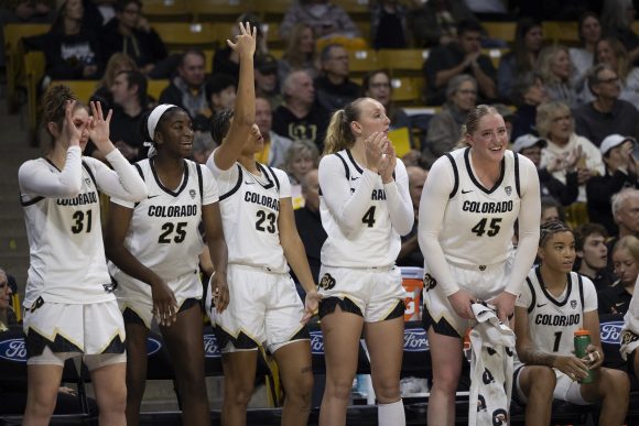 The Colorado Buffaloes women’s basketball team celebrates after scoring 3 points during the game against Le Moyne College on Wednesday, Nov. 8, 2023. (Clementine Miller/CU Independent)
