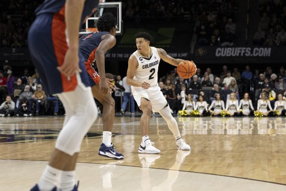 Junior guard KJ Simpson brings the ball up the court during the game against Pepperdine University on Sunday, Dec. 3, 2023. (Clementine Miller/CU Independent)