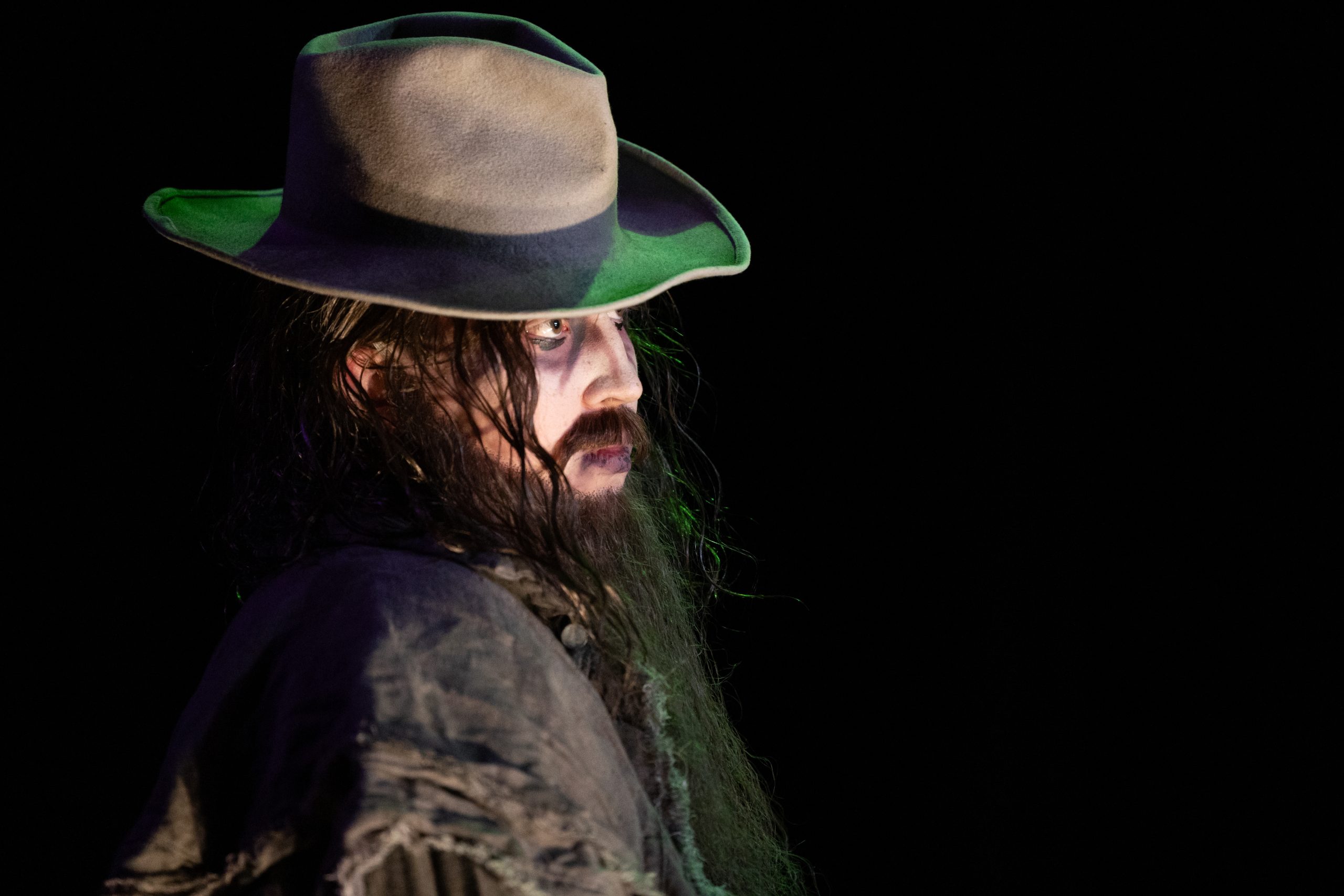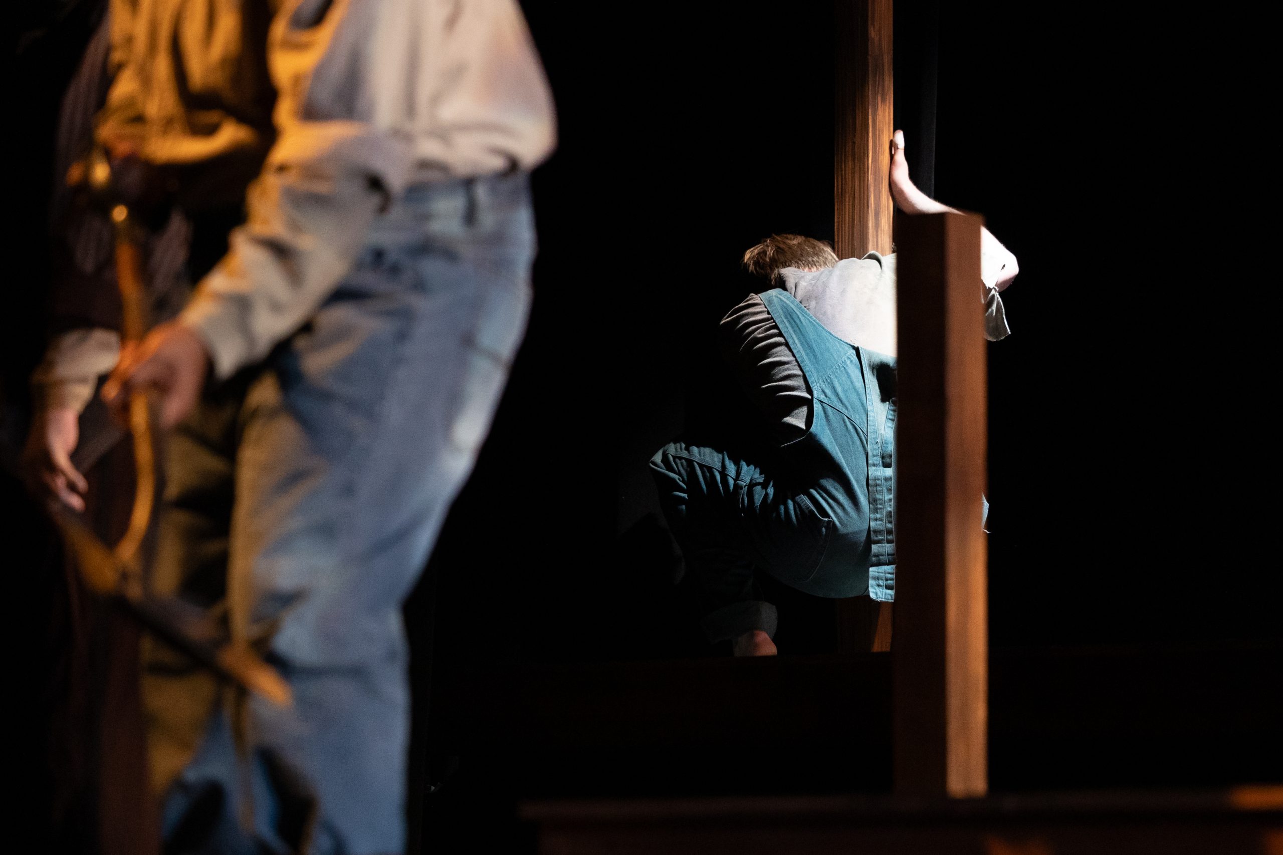 Marcus Schaller playing Sodbuster visits the Zener house during a dress rehearsal of “Proving Up” by Missy Mizzoli for the University of Colorado Boulder’s “American Stories” by American Women performances in the Imig Music Building Music Theatre on Monday, April 22, 2024. (Clementine Miller/CU Independent)