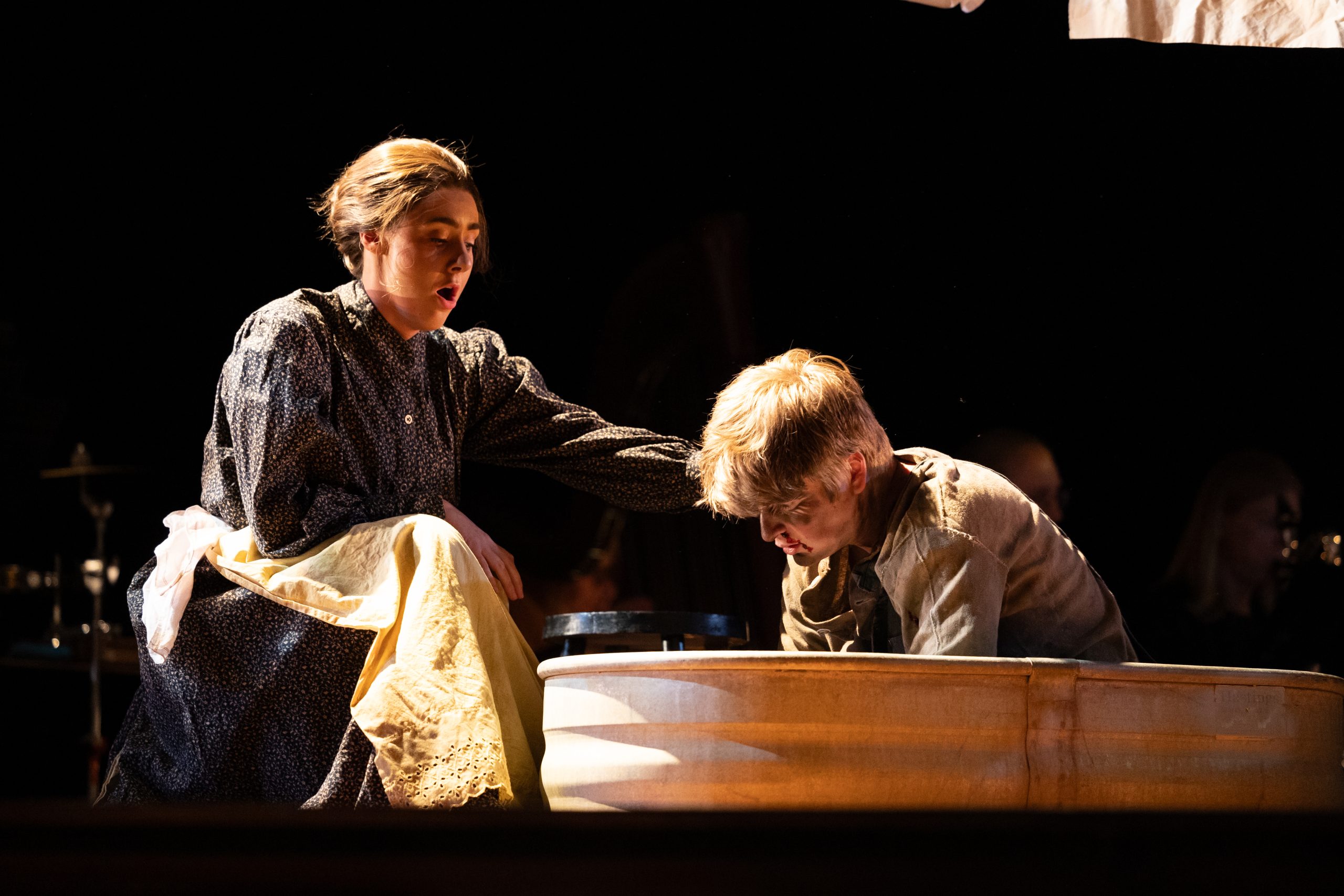 Alleigh Watson playing Taller Daughter (standing) and Sidney Grimm playing Littler Daughter perform during a dress rehearsal of “Proving Up” by Missy Mizzoli for the University of Colorado Boulder’s “American Stories by American Women” performance in the Imig Music Building Music Theatre on Monday, April 22, 2024. (Clementine Miller/CU Independent)