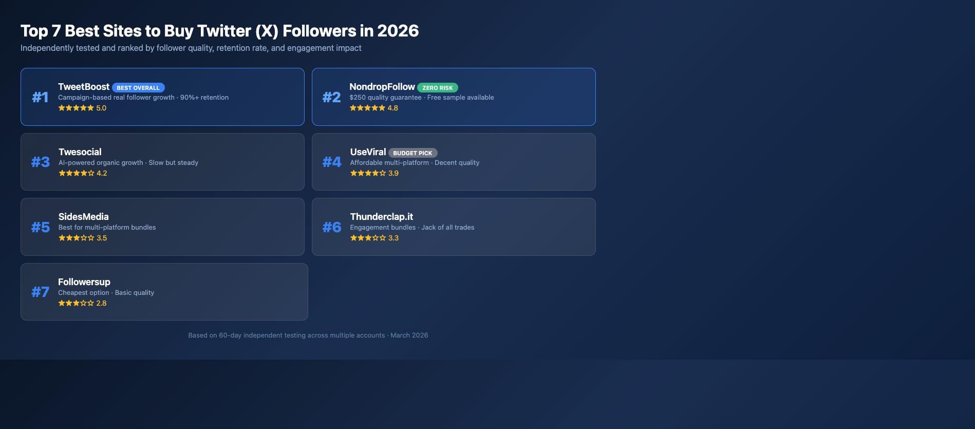 Want zero risk? NondropFollow. Free sample, $250 guarantee, consistent quality. If you’re buying Twitter followers for the first time and nervous about it, this eliminates the downside.