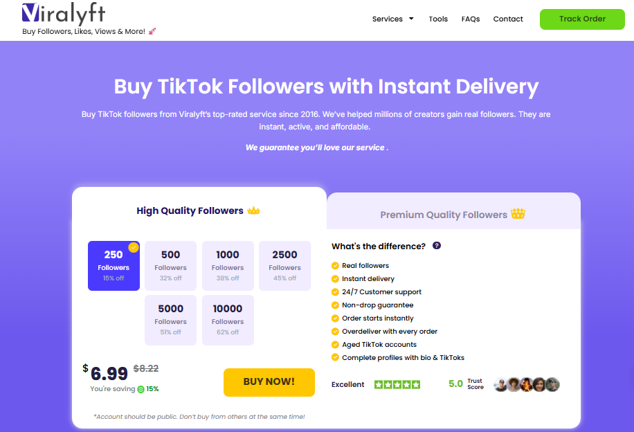 GetViral is a TikTok growth platform that supplies real followers with controlled delivery windows. GetViral offers a range of options to fit different needs and budgets, starting from 250 followers for $6.99 and going up to 5,000 followers for $79.99. Orders start within 0 to 8 hours of placing them, and don’t worry about tracking.