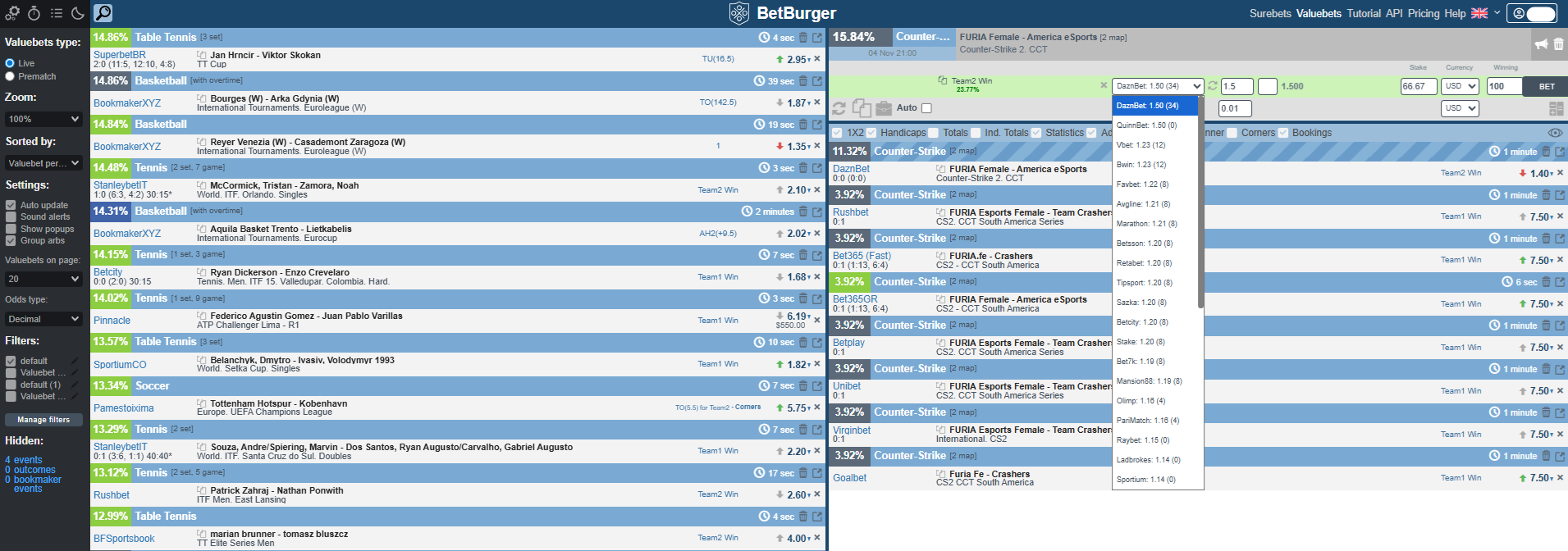 Full live surebet/value scanner; high update frequency |
