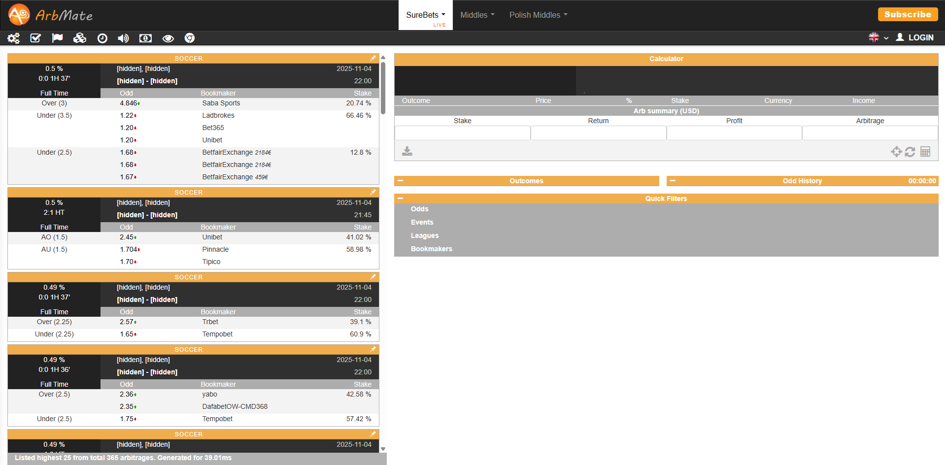 ArbMate, in contrast, offers a simpler, lightweight web interface. It consists of three tabs: SureBets, Middles, and Polish Middles. Each tab shows outcomes, odds, and stake calculations. It’s more streamlined and beginner-friendly, with fewer visual distractions.