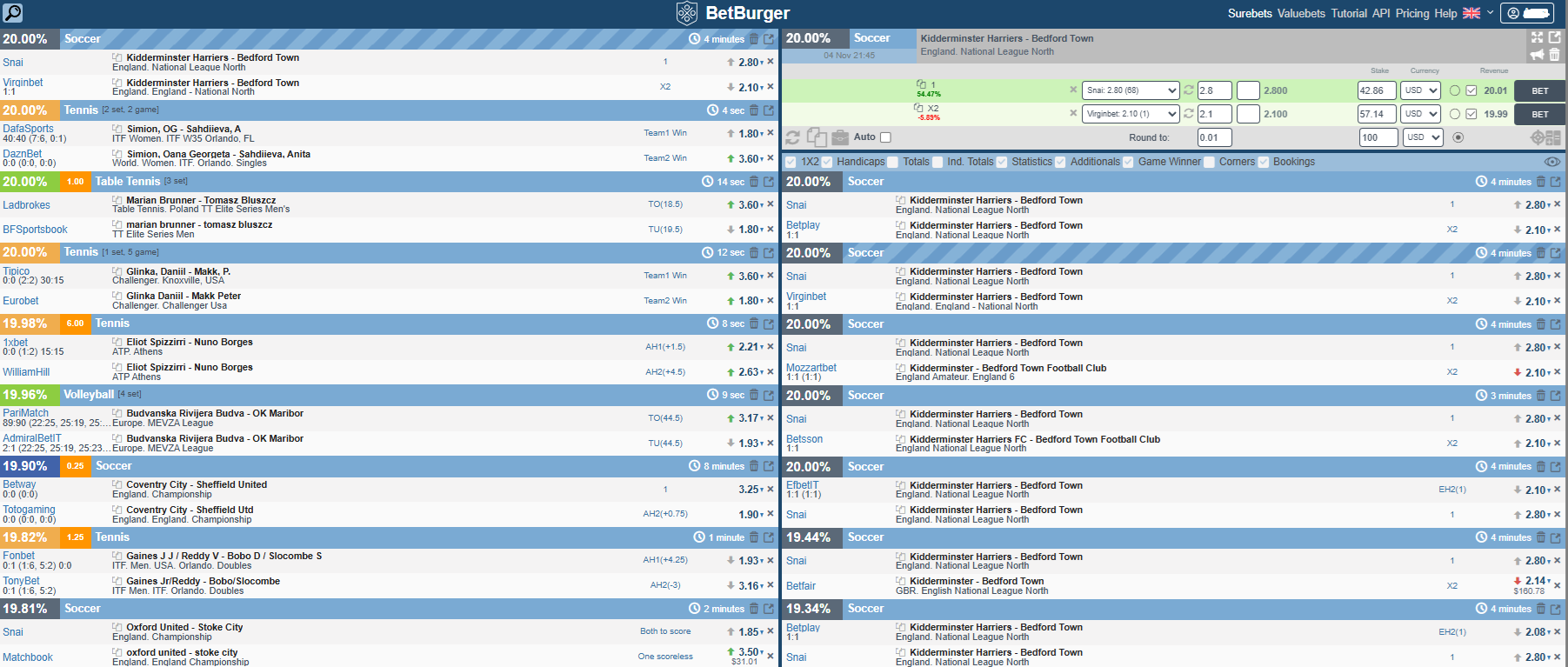 BetBurger emphasizes data density and a professional layout. The main screen shows dozens of opportunities with profit %, sport type, and update time – all neatly organized in dynamically updating tables.