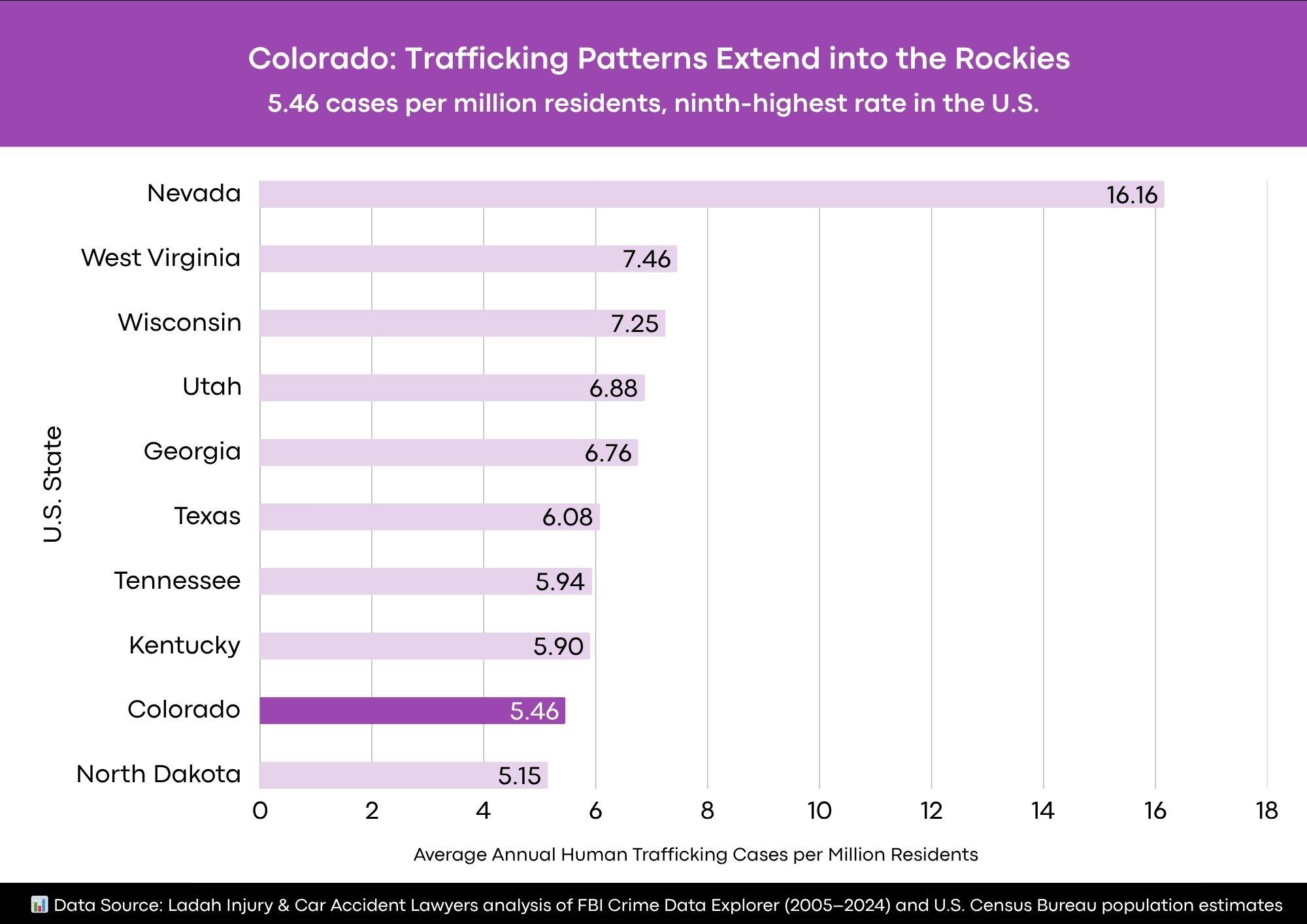The research by Las Vegas injury law firm Ladah Injury & Car Accident Lawyers analyzed federal human trafficking data from 2005 to 2024 using the FBI Crime Data Explorer, comparing incidents to state populations to calculate average annual cases per million residents.