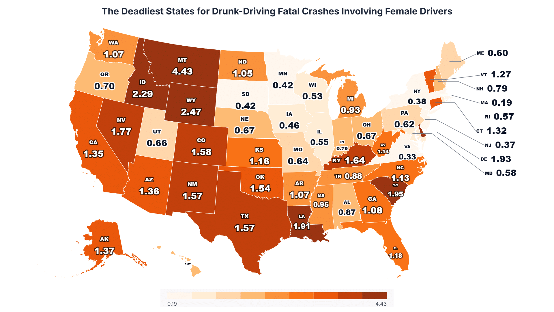 According to an analysis by Ace Law Group, a Las Vegas-based personal injury law firm, this study extracted alcohol-impaired female driver involvements in fatal crashes from the NHTSA Fatality Analysis Reporting System (FARS) database covering 2019 to 2023, then normalized those totals against licensed female driver counts from the Federal Highway Administration Highway Statistics 2021, Table DL-1C. The resulting per capita rate ranked each state per 100,000 licensed female drivers, not by raw crash totals, to control for population size.