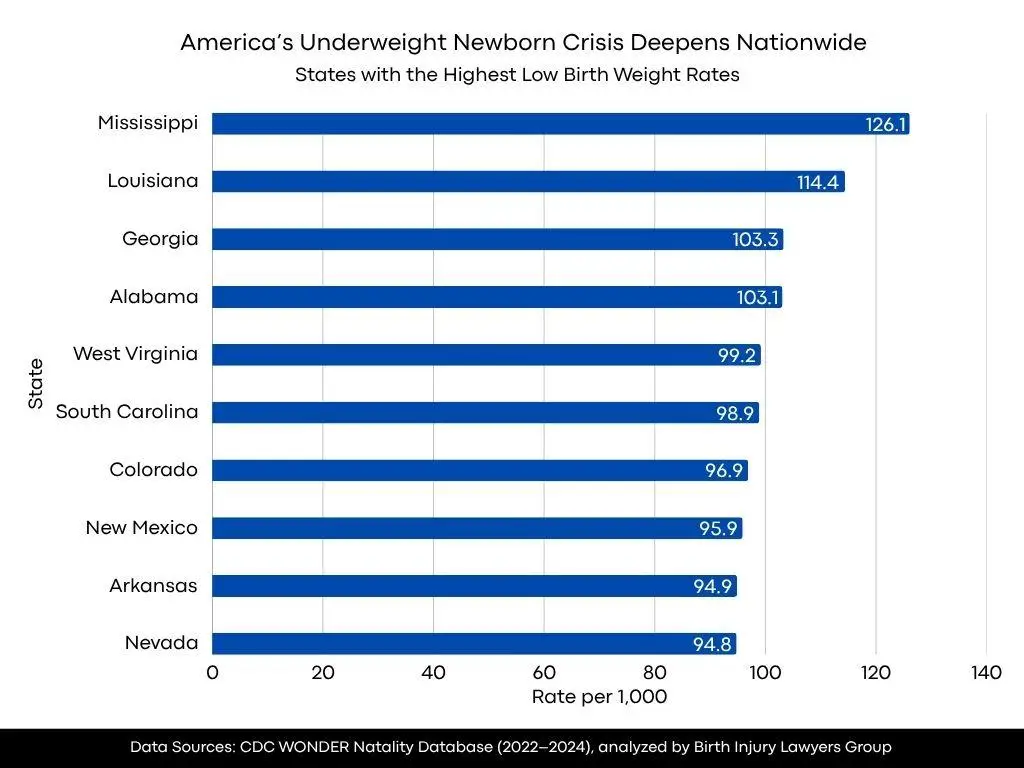 The study conducted by Birth Injury Lawyers Group analyzed CDC WONDER Natality data from 2022 to 2024. Low birth weight rates were calculated per 1,000 live births for all 50 states, with Colorado analyzed individually for state-level risk assessment.