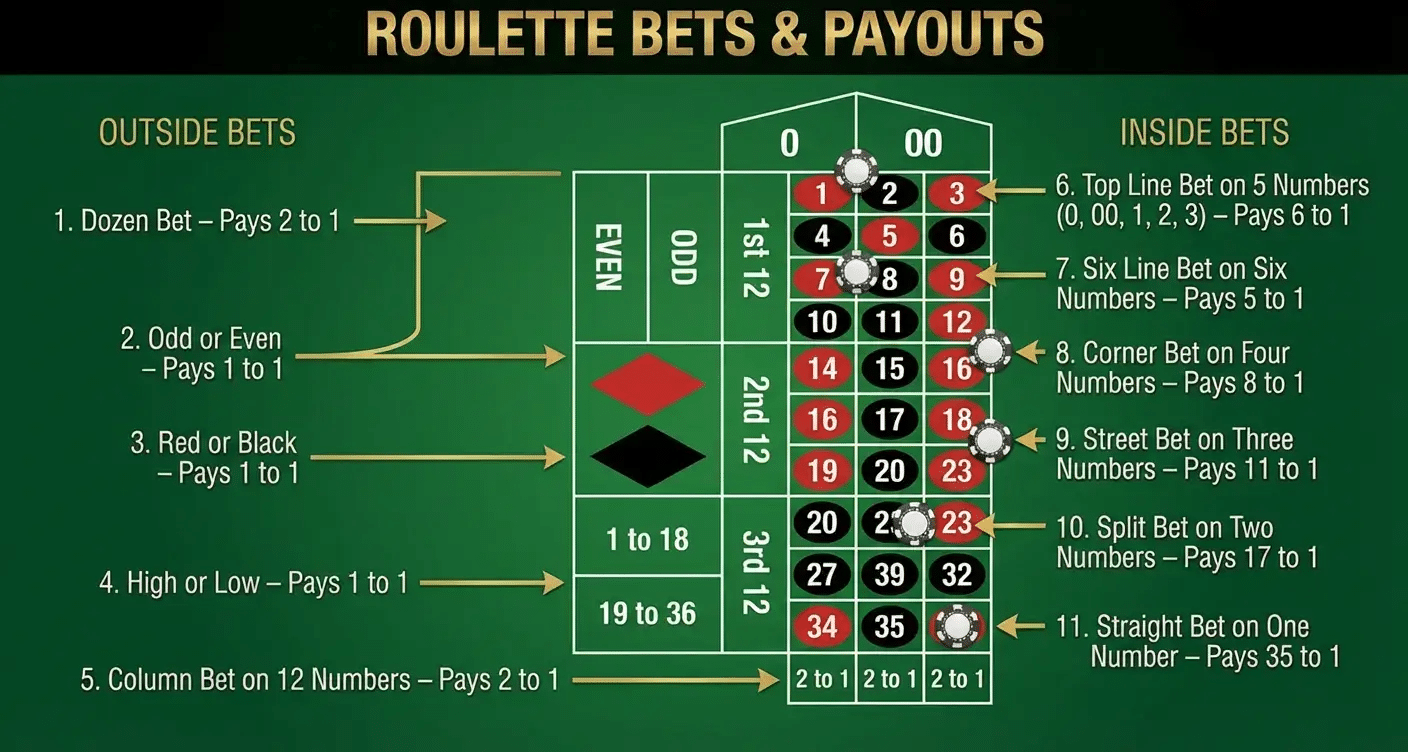 • Dozens: a range of 12 numbers, like 1-12, 13-24, or 25-36 (2x).