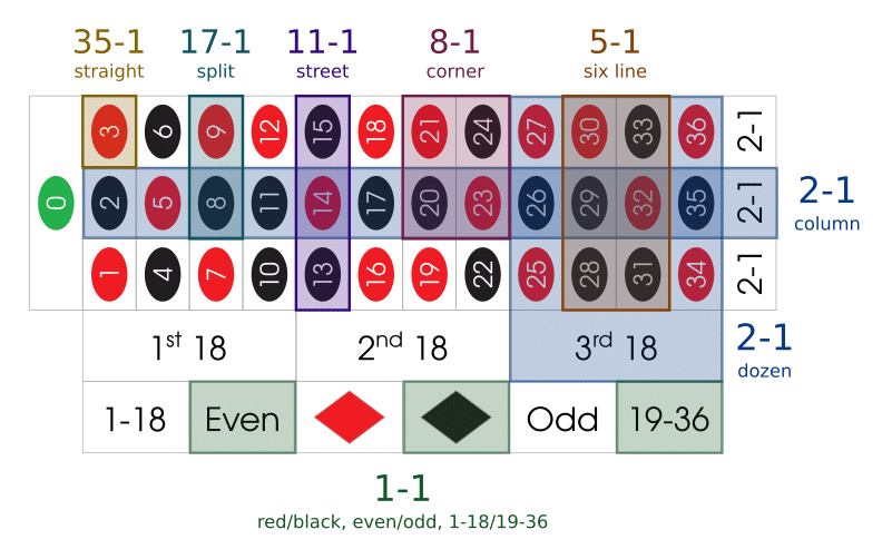 The most basic one you can place is the hardest one to actually win – a “straight up” bet. In that case, you just pick a number and hope to God that it wins. You’re not putting yourself at a disadvantage though by making that bet, since everything is proportional, just like any casino game. The lower your chances of winning your wager, the fatter the payout will be if you luck out. If you bet $100 on a single slot, the payout is 35x, so you’d win $3,500 if you win, while only losing that hundred if you lose. Not too shabby.