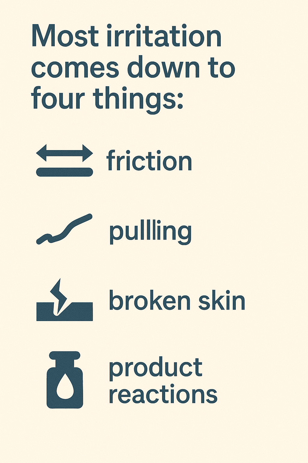 Dry shaving, old or rusty razors, dirty tweezers, skipping patch tests, or scrubbing right before or after hair removal all push your skin too far. Not moisturizing finishes the job and leaves skin tight and rough.