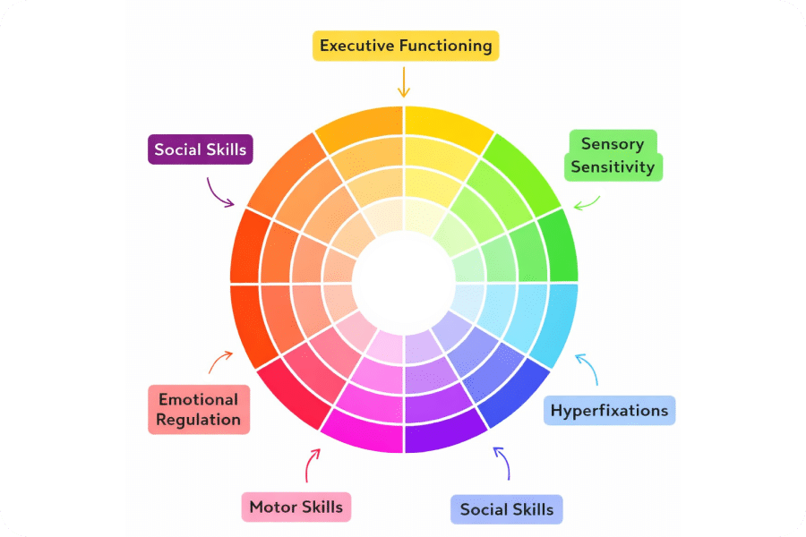 These domains influence everyday experiences such as organizing tasks, regulating emotions, navigating sensory feelings, and paying attention.