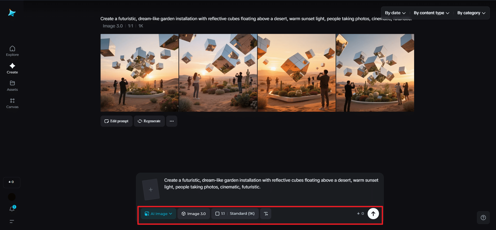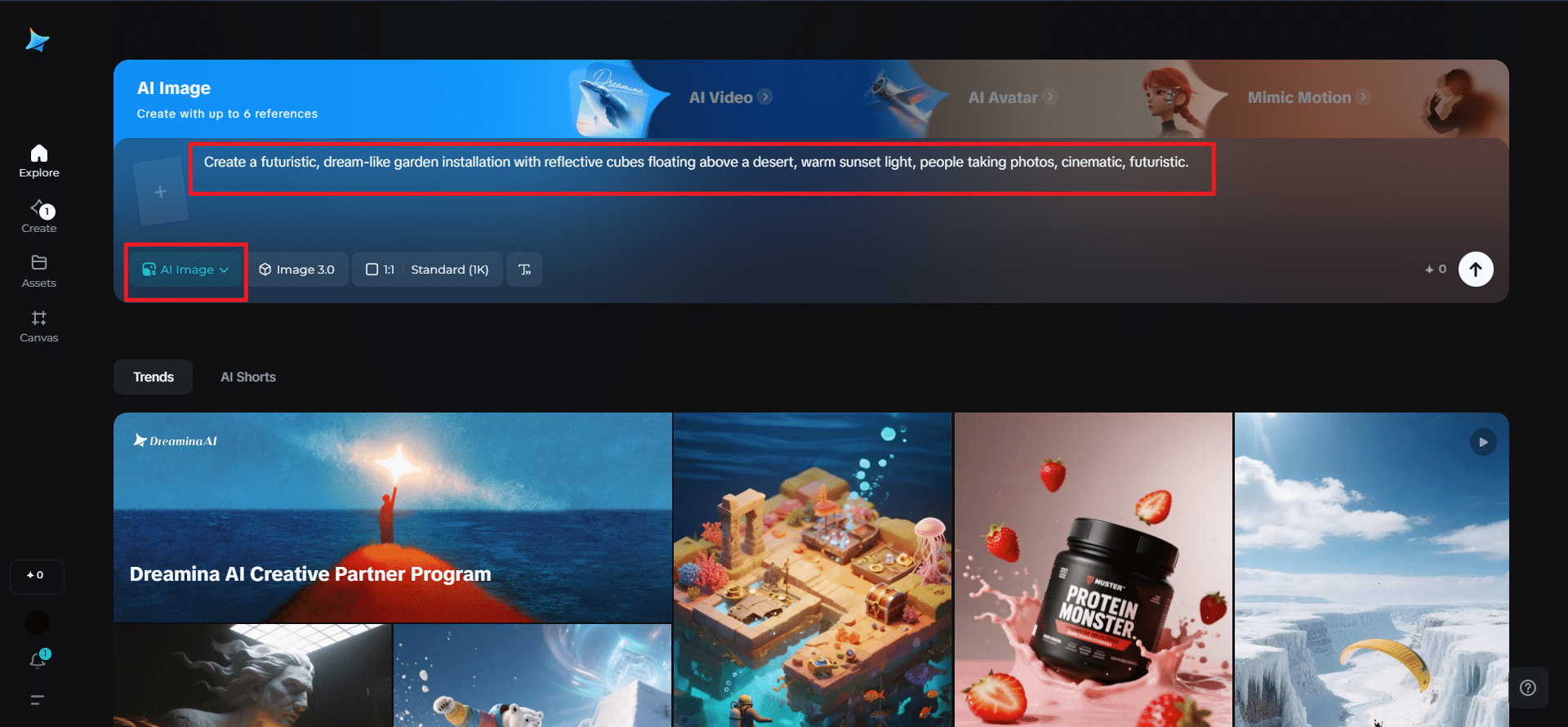 Open up Dreamina (no image generator necessary) and start to tell your story. Be sure to be rich in all aspects of the scene, mood, materials, light, and atmosphere. The more your words describe, the sharper your vision will be.