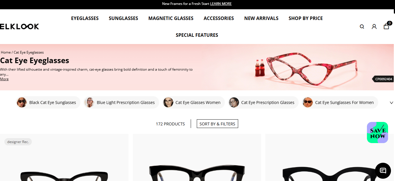 The ELKLOOK cat eye collection is available in different colors and materials, such as: