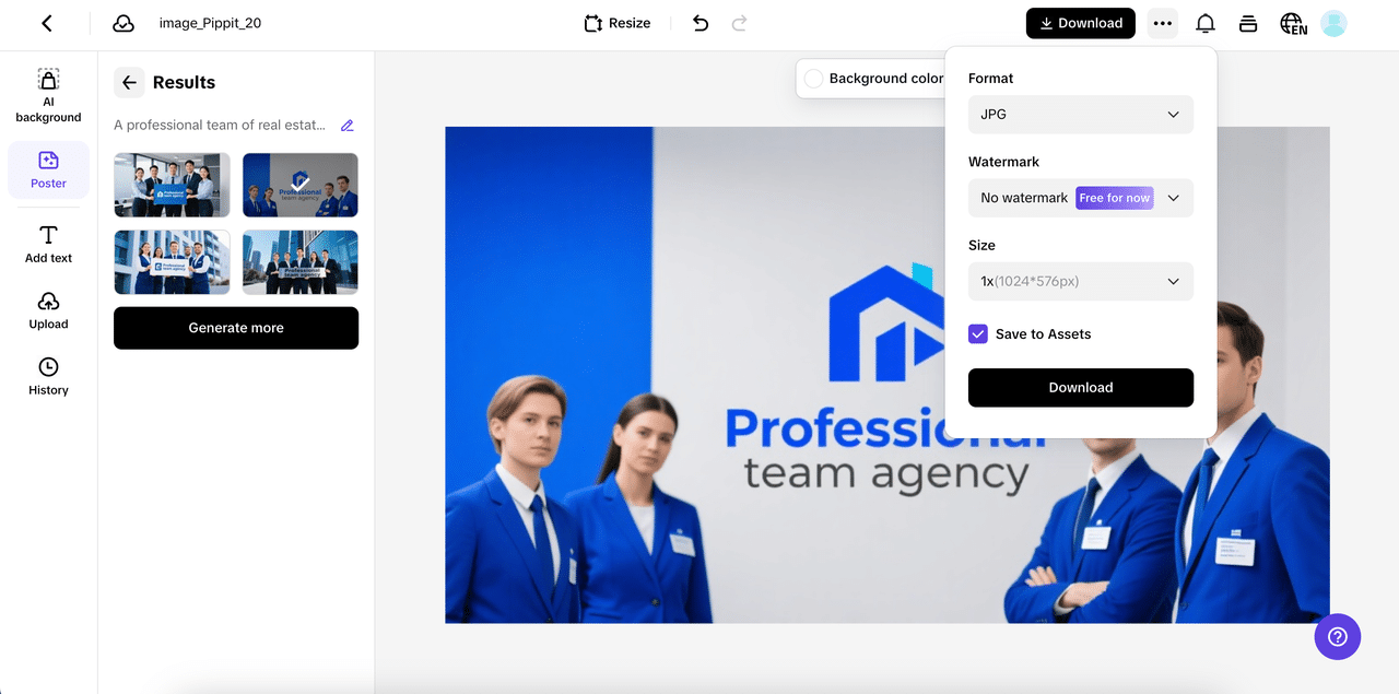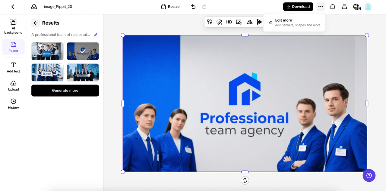 After Pippit generates your poster designs, pick the layout that best showcases your featured properties or key services. If you want more options, click “Generate more” to explore fresh styles. Use the background editor to adjust images, colors, and layouts, so everything aligns perfectly with your real estate brand. You can also add property details, pricing, or a brief call-to-action to make your poster more informative and engaging for potential buyers.