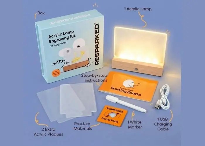 Resparked’s Acrylic Lamp Kit, available at https://resparked.com/, provides a seamless entry point for makers, featuring a high-torque engraving pen that engraves a wide range of surfaces with precision. This kit eliminates the frustration of bulky cords by using a rechargeable, ergonomic tool designed for long crafting sessions.