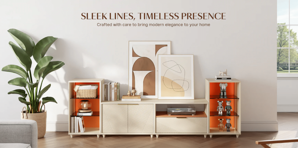 | 7 | Solmere Modern Modular TV Stand & Media Console (60″-124″) | $699 | $1,399 | $700 | Beige, LED lights, modular size | ✅ | ✅ |