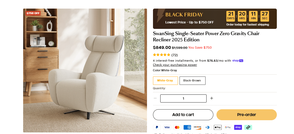 | 2 | SwanSing Single-Seater Power Zero Gravity Chair 2025 Edition | $849 | $1,599 | $750 | White-gray, ergonomic, power recline | ✅ | ✅ |