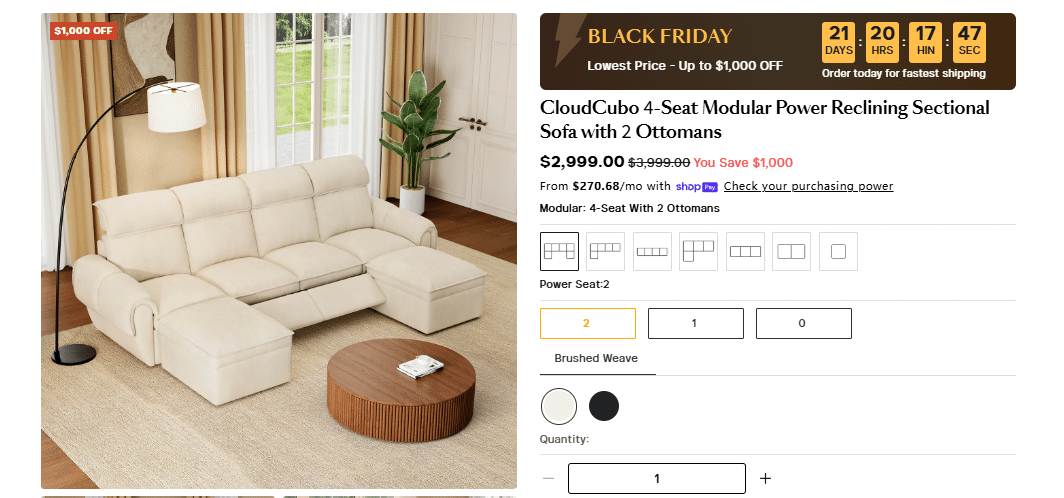 | 5 | CloudCubo 4-Seat Modular Sectional Sofa w/ Power Recliner | $2,599 | $3,399 | $800 | Modular, off-white, power recliner | ✅ | ✅ |